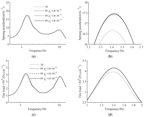 ATID suspension amplitude–frequency characteristics with different planetary gears static friction torque coefficients: (a) sprung acceleration, (b) partial amplification of sprung acceleration, (c) tire load, and (d) partial amplification of tire load.