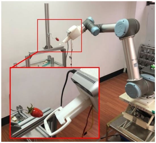 As shown in Figure 10, the proposed visual servo control algorithms for cherry tomato harvesting were demonstrated by the robotic manipulator. The laboratory-based experimental field as shown in Figure 1 was set for the implementation of harvesting, in which an artificial cherry tomato is installed on stainless steel wires with supposed different growth angles.
