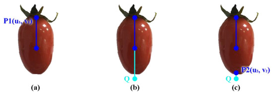Feature point calibration with (a) the farthest point from the centroid, (b) the opposite point of P1, and (c) Q, the closest point to the tomato P2.