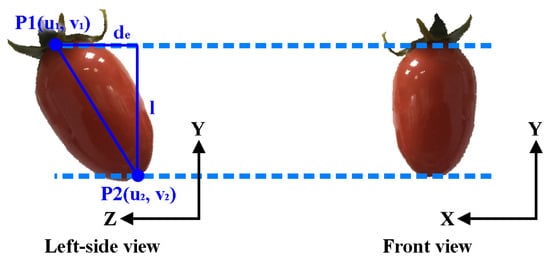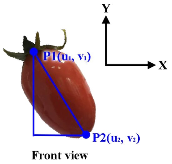 The control and motion guidance of a robotic manipulator for target cherry tomato harvesting are influenced by the targets’ poses in space. In general, the orientation of a fruit can be suitably expressed in spherical coordinates with respect to the image plane. The parameters describing the status of a fruit are the length l of the major axis and two angles, and , respectively, referred to as the polar and azimuthal angles. As shown in Figure 5, the polar angle is the angle between the x axis and the projection of the major axis on the image plane and can be determined using the extracted feature points P1 and P2 as