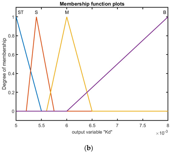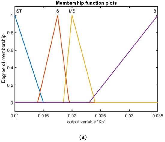 Membership functions of input and output linguistic variables for control gains (a) , (b) .