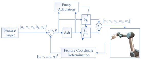 These five errors that encompass three main feature points, i.e., the two end points , and the centroid point in the pixel plane, are used to compensate for the alignment positioning and orientation errors during the reaching and harvesting phase. The basic visual controller design for a conventional IBVS almost employs proportional control to generate the control signal. However, this method cannot have a faster control convergence and a smaller error. In this paper, a PD control with fuzzy gains is adopted to improve the visual feedback quality.