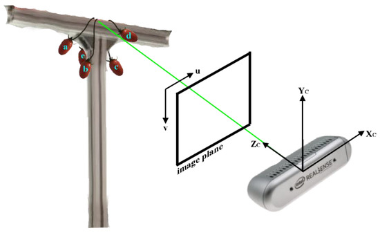 in which A is the camera intrinsic matrix, with A = representing the relationship between the camera frame and the image frame. It can be obtained through measurement or calculation using the given FOV; and are the effective focal length in pixels of the camera along the and axes; γ is the camera skew factor, and (, ) indicate the difference between the camera center and the image center. In addition, the extrinsic coordinate transformation matrix B = expresses the relationship between the object frame and the camera frame with being defined as the rotational matrix and t as the translational displacement from the camera to the object. The rotational matrix can be determined from the equivalent angle-axis representation that is constructed by the polar and azimuthal angles, as discussed in Section 2.4.