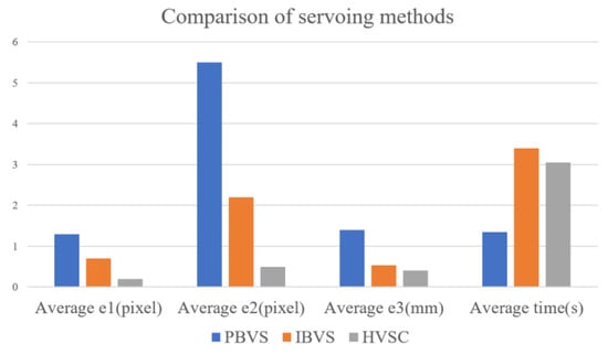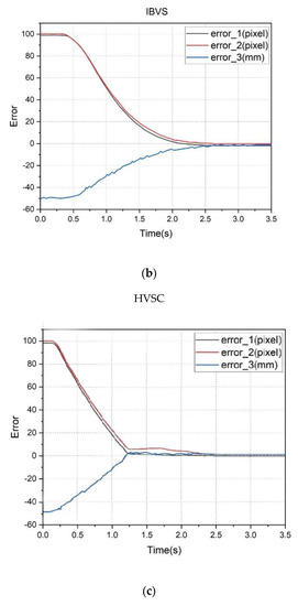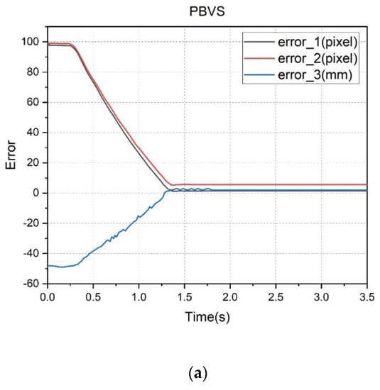 The errors , , and by the three visual feedback controllers are presented in Figure 11. It is shown that the three controllers can effectively align the target and reach the operation position. Their performances were compared as shown in Figure 12. The PBVS has larger errors in , , and because of the camera parameters’ uncertainty and measurement errors that lead to inaccuracy in the coordinates of the target in space. However, the PBVS has a shorter execution time because the PBVS need not frequently capture images to serve as feedback information.