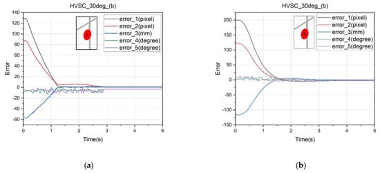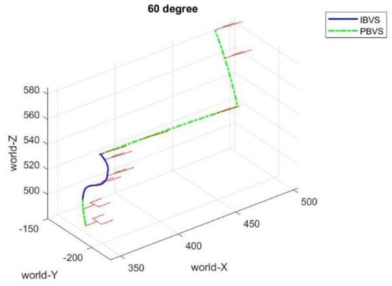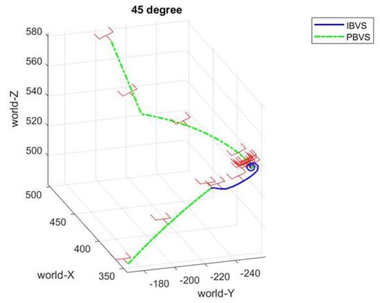 As mentioned in the preceding, PBVS makes use of a depth stereo camera to identify the target, and then the associated position is calculated by converting the desired point in the image frame to spatial coordinates. However, the conversion may result in an uncertain error because of the intrinsic and external camera parameters. Also, in the process of traveling, the position errors of the end effector will cause a serious localization deviation due to unexpected external disturbances. The errors of position are even accumulated more and more with the traveling distance. IBVS takes advantage of pixel coordinates in the image plane for feedback control without conversion to spatial coordinates, and thus the required calculation loading is comparatively lessened. Moreover, the target information is constantly returned for feedback control while traveling, so it has a higher localization accuracy than PBVS under the identical disturbances. However, the pixel-based control may cause the robotic manipulator to generate a larger response in space. The main drawback of IBVS using a fixed camera is the limited field of view. When the robotic manipulator rotates, the target may be out of the field of view, and the IBVS will fail to control the manipulator. Therefore, an HVSC integrating PBVS and IBVS was proposed for the tradeoff.