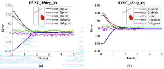 In this subsection, the HVSC with a separation constant and fuzzy feedback, respectively, were performed and compared for target localization with varied poses. The results for reaching the operation position are presented in Figure 13 with , and Figure 14 with , . Even when the target has a far distance from the end effector, it is seen that the HVSC with fuzzy feedback gains has better stabilization than the constant gains, due to robusticity against disturbances. In addition, the performance for larger pose angles may engender a larger localization deviation because the larger pose angles are difficult to compute and identify accurately.