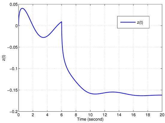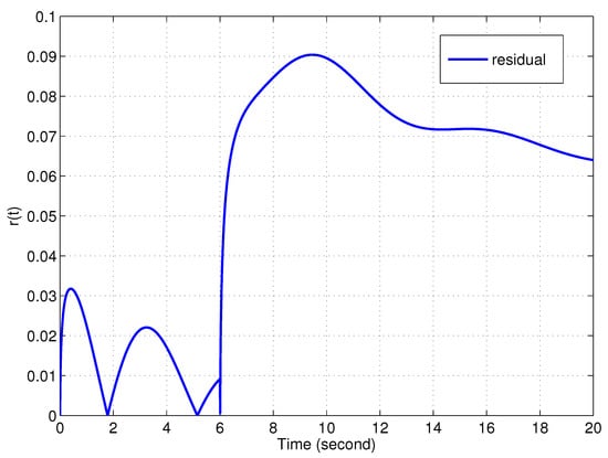 Figure 2 displays the residual signal . It can be found from Figure 2 that the residual signal has large discrepancies when the fault occurs. Figure 3 shows the regulation output of the augmented system (7). From Figure 3, we can see that the influence of the disturbance and fault on the output has been weakened. Furthermore, Figure 4 plots the residual evaluation function. By using a threshold test , we can effectively detect the fault at approximately .