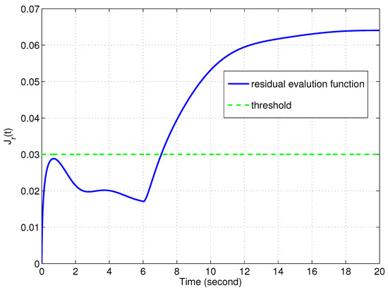 Aimed at fault detection, a widely used method is as follows. First, we define a threshold and use the logic unit, and then follow the results in []. Based on the above, we can define the residual evaluation function as follows: