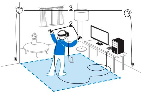 HTC Vive Setup with headset (1), controllers (2), and towers (3) [].