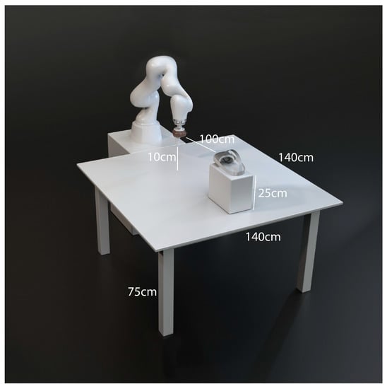 Two different setups were used. In the first, the robotic arm was mounted on a table with its base facing up and its arm bent over the table, with the flange facing downwards, parallel to the base. The headset was placed facing the controller, 1 m away from it and on its level. The LT300 light-meter was placed just below the headset. Figure 2 shows this setup.