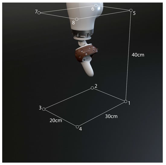 Research was carried out on the methods used for precision and accuracy measurement of various VR systems. Most of the works found tested the HTC Vive [,,,,] with the objective of validating this system for scientific research and medical purposes [,], but some also tested the Oculus headsets [,,]. The HTC Vive has three main components: a headset, trackers, and towers. The towers are usually placed in the corners of the room, and the trackers can either take the shape of a controller or a disk that can be attached to objects. Figure 1 shows how the HTC Vive is set up in a regular room. The Oculus Quest system has only two components: a headset and two controllers.