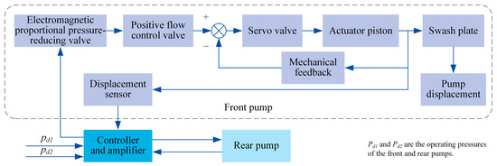 The dual-loop control method is used to divide the entire control system into an inner loop and an outer loop [26]. The inner loop controller is primarily responsible for monitoring and regulating the actual output of the system to ensure the response speed and accuracy of the system, while the outer loop controller is responsible for controlling the stability of the system. In instances where the inner loop control ensures accuracy and response speed, output signal adjustments are executed by comparing the output signal with the reference input signal to maintain system stability. The original mechanical–hydraulic servo control system serves as the inner loop of the dual-loop positive flow control system. A displacement sensor installed at the actuator piston detects its position, and the theoretical output flow is calculated to serve as feedback for the target flow, forming the outer loop of the dual-loop positive flow control system, as illustrated in Figure 1. As the control system structures of the front and rear pumps are identical, in Figure 1, only the control system structure of the front pump is detailed, and the control system of the rear pump is shown in simplified form.