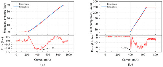 Figure 7 shows the test and simulation results of the output characteristics of the electromagnetic proportional pressure-reducing valve and the main pump of the bi-tandem axial piston pump. The secondary pressure test of the electromagnetic proportional pressure-reducing valve shows the same trend as the simulation, and the test results fluctuate near the simulation results. However, there is still a certain deviation. The maximum deviation of the secondary pressure is only −1.22 bar, so the high degree of similarity between the test and simulation results underscores the accuracy of the simulation model. Similarly, the output flow test results of the main pump demonstrated good agreement with the simulation results, albeit with some minor deviations. The maximum deviation of the output flow rate is −7.76 L/min, which occurs at the flow rate starting point, and the range is narrow, so the deviation is acceptable.