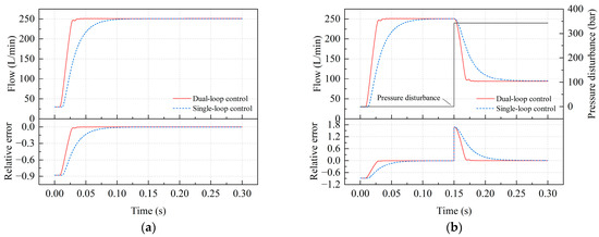 Comparative analysis of the dynamic response of the piston pump with single-loop and dual-loop positive flow control: (a) no pressure disturbance; (b) pressure disturbance.