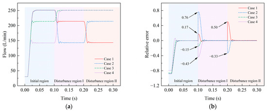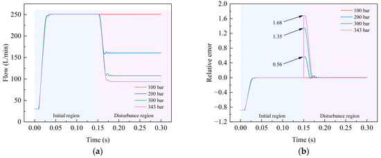 In the initial region, the greater the superimposed pressure disturbance, the greater the output flow overshoot. In each disturbance region, the output flow oscillation is the weakest when disturbed by full unloading pressure. The pattern of the smaller maximum relative error caused by unloading pressure disturbance relative to loading pressure disturbance is still demonstrated in each disturbance region, as shown in Figure 15b.