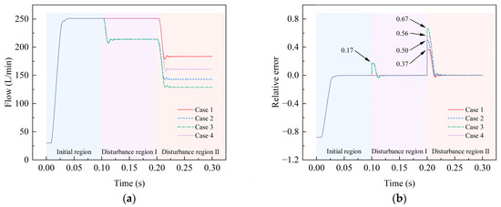 Dynamic response of the bi-tandem axial piston pump under different degrees of symmetric pressure disturbance: (a) flow; (b) relative error.