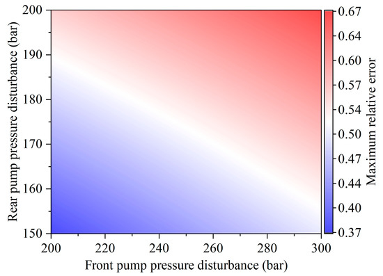 Effect of pressure disturbance degree of the front and rear pumps on the maximum relative error at the second point of disturbance.