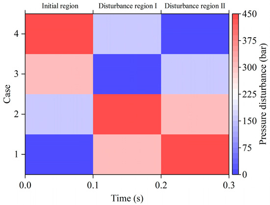 The initial displacement of the front pump and the rear pump is set to the maximum displacement, the initial load pressure is set to 0 bar, the pressure disturbance time point of the front pump is 0.1 s (the first disturbance point), and the pressure disturbance time point of the rear pump is 0.2 s (the second disturbance point). Different degrees of asymmetric pressure disturbance are selected for double pumps, as shown in Table 2, to analyze the effect of different degrees of asymmetric pressure disturbance on the dynamic response of the bi-tandem axial piston pump.
