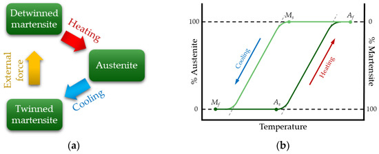 Shape Memory Alloys (SMAs) are a class of metallic alloys that can be classified into two categories based on the type of stimuli they respond to, i.e., thermo-responsive and magneto-responsive [39]. The first type can be activated thermally by heating, and the second type reacts to static and oscillating magnetic fields. The underlying driving mechanism in both cases is the reversible martensitic transformation. In particular, thermo-responsive SMAs can be plastically deformed when subjected to a mechanical load below a certain temperature, and can revert to the original shape between two transformation phases (austenitic and martensitic) when heated above a certain temperature. The increase in temperature can be also induced by Joule effect when SMAs are powered electrically. In this case, they can be classified as three stage smart actuators (i.e., Joule effect to temperature variation to mechanical deformation). SMAs can exist in three different crystal structures, i.e., austenite, twinned martensite, and detwinned martensite (Figure 3a) [23]. At lower temperatures, the martensite phase is stable, while austenite is stable at higher temperatures. The thermoelastic transformation of martensite depends on two effects: the shape memory effect (SME) and superelasticity. Figure 3b shows the difference in transformation temperature from the martensitic to the austenitic phase. During cooling, Ms is the martensite starting temperature, and Mf represents the martensite final temperature. In the same way, As and Af indicate the austenite starting and final temperature, respectively [5]. The SME phenomenon occurs when the structure is heated or cooled to specific characteristic transition temperatures, and afterward, SMAs recover their original size and shape.