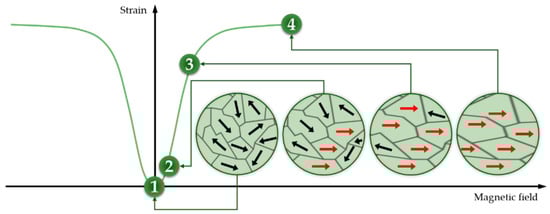Magnetostrictive materials are able to convert energy between the magnetic and elastic states [1]. This phenomenon, known as magnetostriction, describes the alteration in physical dimensions that many magnetic materials show when their magnetization changes. The magnetostriction energy transformation process is bidirectional: from mechanical deformation to magnetization, and vice versa. These materials have complex behavior because of their frequency-dependent hysteresis and nonlinear properties. The material’s molecular dipoles and magnetic field boundaries rotate to align with the field as a magnetic field is applied. The material elongates or contracts as a result. Figure 4 shows a schematic representation of the deformation of a magnetostrictive material when a magnetic field is applied, and by way of illustration, four points along the curve are described: