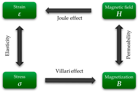 where CH is the elastic compliance coefficient matrix under constant field H, and λ indicates the magnetostrictive coefficient. In addition, that strain can produce a stress due to the material’s elasticity, which in turn can produce magnetization. The latter phenomenon is called the Villari effect, and it can be expressed as follows [43]:
