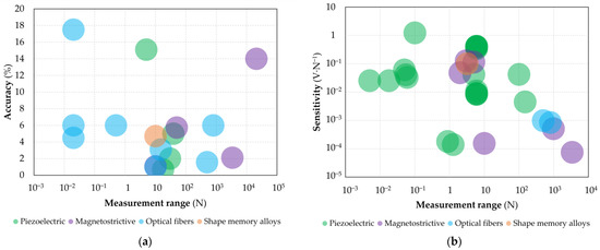 Finally, Royandi et al. [104] designed and developed a prototype piezoelectric sensor for force measurement consisting of a PZT disk. The sensor was characterized by numerical simulations and experimental tests. The obtained results proved that the sensor was able to measure forces in the range 0–100 N, producing an output voltage from the amplifier circuit in the range 0–4 V, thus obtaining a sensitivity of 42 mV·N−1.