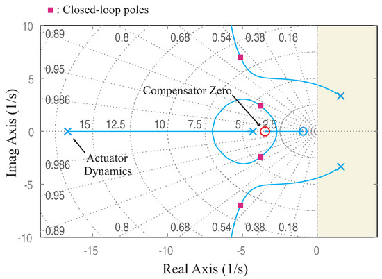 Root–locus plot trajectories as a function of the proportional feedback gain for PD control of the robot with and mm. The open-loop poles and zero are in blue. The red squares indicate the closed-loop poles location obtained with .