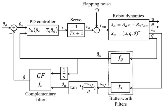 The aerodynamics of the flapping-wing robot at hovering is extremely complex and is out of the scope of this paper. The time histories of the lift, drag, and aerodynamic torque (measured by attaching the robot to a load cell) exhibit strong harmonic components at frequencies multiple times the flapping frequency, with peak amplitudes significantly larger than their cycle-averaged values (Appendix A). For the present discussion, these periodic disturbances appear as input noise, the drag noise d is added to the right-hand side of Equation (2), and the torque noise is added to the right-hand side of Equation (3). These periodic disturbances enter at the input of the system and induce strong vibrations which propagate to the inertial unit (IMU). This process, which belongs to the physics of the flapping flight, was judged important enough to justify to include two IMUs with different saturation thresholds in the design of the control board.