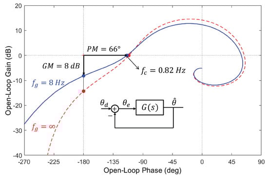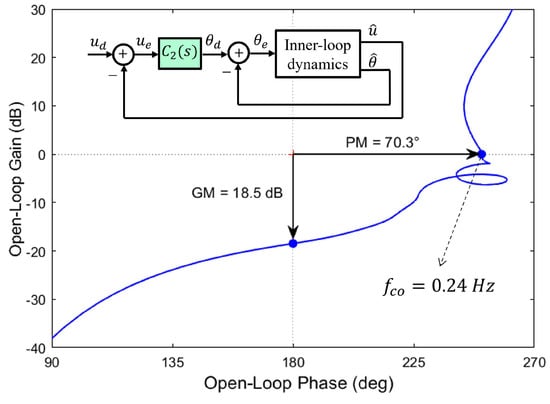 Unlike the complementary filter which estimates the pitch angle , the full-state dynamic observer also reconstructs the linear velocity which allows direct control of the robot’s hovering and, more generally, of the trajectory. Figure 12 shows the cascade structure of the control system; is the desired axial speed and is the reconstructed one; is the velocity error. The transfer function between and is that of a SISO system. The compensator transforms the velocity error into a pitch angle demand . According to Equation (2), in steady state (at equilibrium, ), the drag force is balanced by the tilting of the lift force, . It follows that . Figure 13 shows the Nichols plot of the transfer function when a P + I compensator is used: