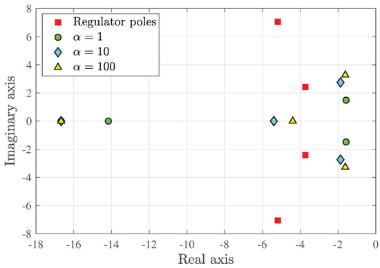 Figure 8 shows the observer poles for three values of , respectively, 1, 10, and 100. The figure includes the poles of the PD regulator shown earlier in Figure 4. The value of has been used in what follows.