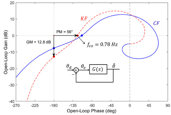 Nichols plot for the Kalman filter (KF) () and the complementary filter (CF) of Figure 6.