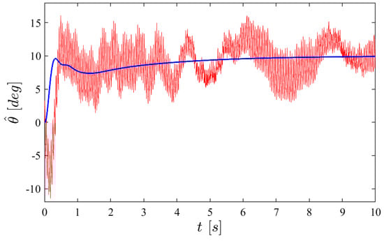 Figure 11 shows the time history of the pitch angle estimate for a step response of . The smooth line (blue) corresponds to the case where the flapping noise is ignored; the noisy curve (red) accounts for the drag and pitch torque noise shown in Appendix A. The time–history integration includes a saturation of the control torque 200 g·mm (2 N·mm).