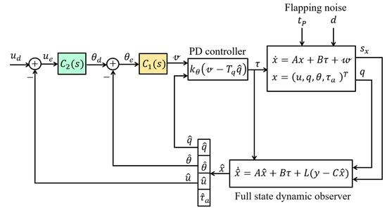 w represents the system noise produced by the flapping of the wings, , where d is the drag force and is the aerodynamic pitch torque due to the flapping of the wings. Both are periodic; they are documented in Appendix A.