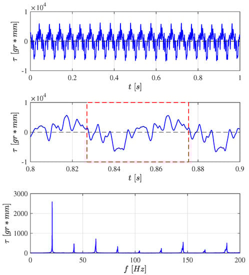 Figure A2 shows the time history of the actual aerodynamic torque. Here, again, the signal is periodic and extremely complicated, with peak values up to 30 times the maximum value of the pitch and roll control torques which are limited near ±200 g·mm (2 N·mm) [1]. In the cycle-averaged model, this periodic disturbance torque enters at the input of the system and induces strong vibrations that propagate to the inertial units [Equation (16)]. The RMS value of the aerodynamic torque is 0.0273 Nm (2780 g·mm).