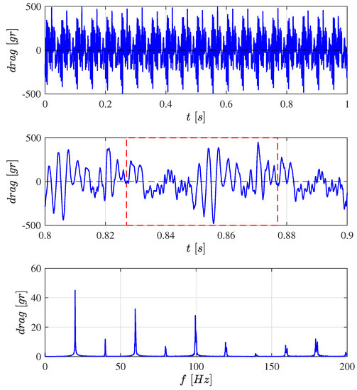 Similarly, Figure A3 examines the drag force d when the flapping frequency is 19.9 Hz. The peak values are up to 20 times the average lift. In the cycle-averaged model, this produces a periodic disturbance force d in the right-hand side of Equation (16) that excites the robot and propagates to the IMU. Note that the average value of 2.6 g indicates that the wing behavior is not exactly symmetrical between the upstroke and the downstroke, producing a net axial force. At hovering, such a bias force has to be balanced by tilting the robot by . The RMS value of the aerodynamic drag is 0.985 N (100 g).