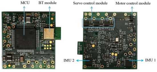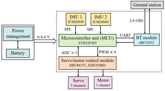 The data acquisition rate is 500 Hz (three accelerometers and three gyros). The MCU unit, STM32F405, has a clock frequency of 168 MHz. The nominal battery input is 7.4 V; it is regulated to supply the main motor (6 V), the servo actuators (4.2 V–6 V), and the IC components (3.3 V and 1.8 V). Additional I2C and SPI ports are reserved for future optical sensors.