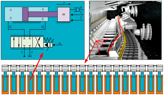 Figure 1 shows the multi-cylinder system of hydraulic support in a coal-mining face. Each single hydraulic support moving cylinder system is a typical valve-controlled single-rod cylinder system, where only the position signal can be measured by the displacement sensor [36]. However, multiple cylinders of the hydraulic support often move at the same time to meet the requirements of rapid mining, so it is necessary to improve the position accuracy and synchronization accuracy of the multi-cylinder system under disturbance conditions.