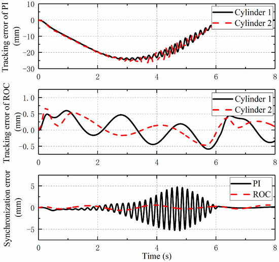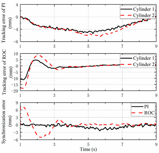 Figure 7 shows the position tracking performance of different controllers. It can be seen that the maximum tracking error of the moving cylinder with PI controller is about 7 mm, and the maximum tracking error of the double cylinders both appear at the place with the fastest movement speed. Due to the self-learning ability of the neural network, the tracking error of the twin cylinder under the ROC controller is relatively large in the initial stage of motion. With the increase of learning time and existing data, the tracking accuracies of the double cylinders are greatly improved and stabilized at about 1 mm. Compared with the PI controller, the synchronization accuracy of the ROC controller is lower in the initial stage, but with an increase in the movement time, the tracking accuracy of the ROC controller quickly reaches a higher value, and the synchronization accuracy of the dual cylinder is also greatly improved at this time. To make the comparison clearer, the average tracking error of the adjacent double cylinders for two controllers is calculated in Table 2. It can be seen that the tracking accuracy of the moving cylinders with ROC controller is improved by 47.2% and 30.6% compared with the PI controller, while the PI controller has the smaller absolute mean error with 0.63 mm. However, the maximum synchronization error of the PI controller in the later stage is 2.5 mm, while the synchronization accuracy of the ROC controller is basically stable at about 1 mm, which means that the ROC controller has a high straightness after motion. In other words, the ROC controller has the same simple structure as the PID controller, and it can estimate and compensate the unknown force disturbance and unmodeled dynamics of the system, which helps to have better robustness and control accuracy and meets the development demand of the intelligent hydraulic support.