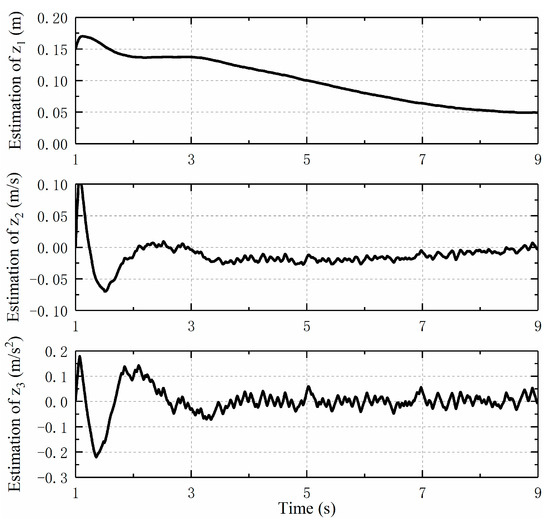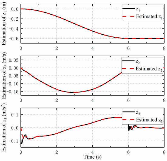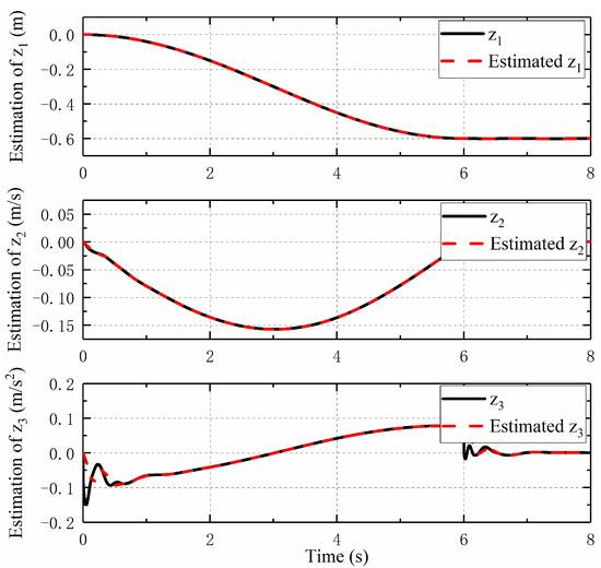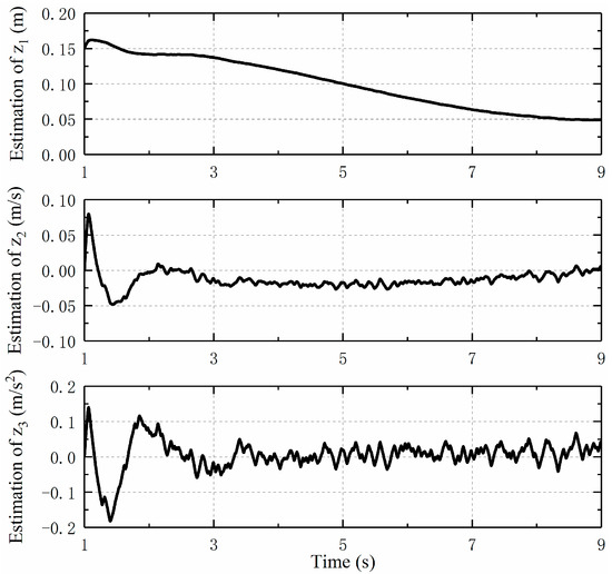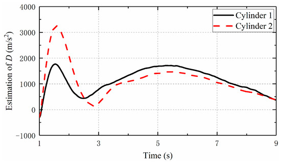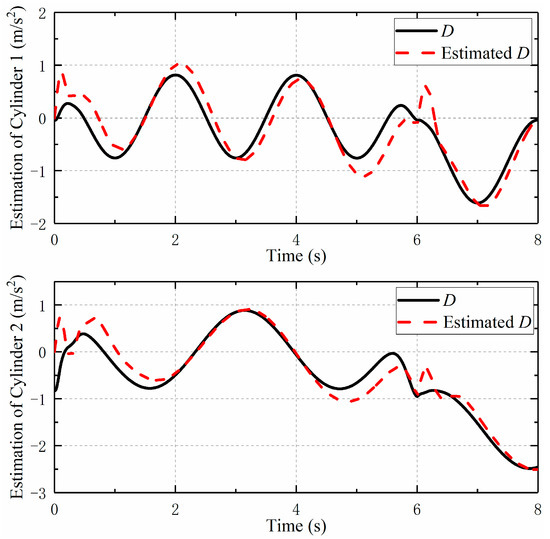Figure 8 and Figure 9 show the observation of the states of the moving cylinders by HOD. In the presence of noise, the influence of the measurement noise is often amplified when calculating the moving cylinder speed and acceleration, so the obtained velocity and acceleration will have a great impact value. In other words, the obtained signal shock will be larger as the derivative order increases, whereas when the designed HOD is used to estimate the system states, the negative impact of noise can be avoided. It can be seen from the figures that the observed velocity and acceleration curves of the double moving cylinders are smoother, which is helpful for the further design of the output feedback controller.