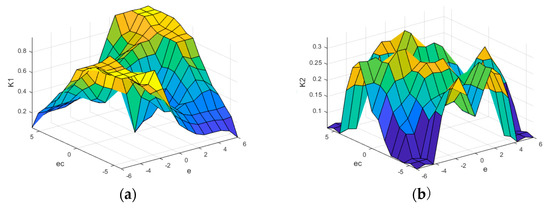 The input and output variables are multiplied by the corresponding quantitative factors and the proportional factors, thus the transformation of the two-dimensional quantity from the basic field to the fuzzy field is realized, and the transformation of the precise quantity to the fuzzy quantity is realized. The quantitative factors of are , the proportion factors of the correction quantities are . After processing the fuzzy PID controller, the PID parameter adjustment quantities are obtained. The fuzzy rules control table of PID parameters are shown in Table 1, Table 2 and Table 3 and the output adjustment quantities of the PID controller is determined by Equation (11).
