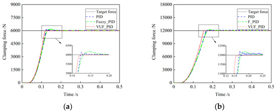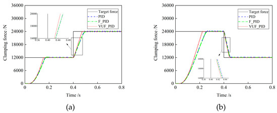 Figure 7a shows the clamping force response characteristic curve of EMB system under increasing brake gear switching condition. In the process of actual clamping force jumping from 12,000 N to 24,000 N, the clamping force response time with VUF-PID, F-PID, and PID control are 0.0755 s, 0.1083 s, and 0.1291 s. The control effect of VUF-PID is 30.28% and 41.52% faster than the other two kinds, respectively. Figure 7b shows the clamping force response characteristic curve of EMB system under increasing brake gear switching condition. In the process of actual clamping force jumping from 24,000 N to 12,000 N, the clamping force response time with VUF-PID, F-PID, and PID control are 0.0471 s, 0.0512 s, and 0.0603 s. The control effect of VUF-PID is 8.01% and 21.89% faster than the other two kinds respectively. It can be seen that the VUF-PID control proposed in this paper still has a good adaptive adjustment ability under the braking gear switching conditions, especially in the initial stage of response, the gain parameters can be better adjusted according to the error and error change rate, so that the desired clamping force can be reached stably, quickly and accurately.