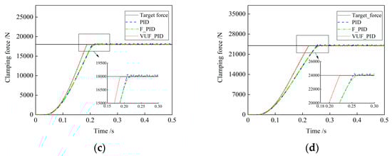 Clamping force response curve under step braking condition: The target clamping force is (a) 6000N; (b) 12,000 N; (c) 18,000 N; (d) 24,000 N.