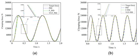 Clamping force response curve under Sinusoidal working condition. (a) 1 Hz; (b) 2 Hz.