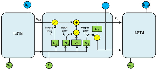 LSTM and GRU are commonly used RNN variants for handling time series data. In comparison to the GRU network, LSTM possesses stronger memory and can capture longer dependencies. which may be more effective in handling long data sequences and modeling intricate systems. LSTM networks can not only solve the problem that traditional RNNs cannot handle the dependence of long sequence data but also the issue that gradient exploding or vanishing is easy to occur with increasing training time and network layers of the neural networks. The LSTM network consists of multiple LSTM units, and its internal structure and chain structure are shown in Figure 1, with its core being the cell state , represented by a horizontal line running through the entire cell at the top layer. It controls the addition or removal of information via gates. LSTM mainly consists of an input gate, a forget gate, and an output gate. The input gate controls which input information needs to be added to the current time step’s storage unit. The forget gate controls which information needs to be forgotten in the storage unit of the previous time step. The output gate controls which information in the current time step’s storage unit needs to be output to the next time step. LSTM introduces a gate mechanism to control information transmission, remember content that needs to be memorized for a long time, and forget unimportant information, making it particularly effective in handling and forecasting critical events with long intervals and temporal delays in sequential data. The formula for an LSTM unit is as follows.