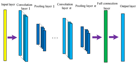 CNN has outstanding spatial feature extraction capabilities. CNN can automatically learn the spatial characteristics of liquid level distribution and liquid pressure in water tank systems. For example, CNN can learn the liquid level distribution at different positions, that is, the changes in water surface height. Meanwhile, by learning the pressure changes hidden in the input and output data, CNN can learn the liquid pressure information at different positions. CNN is mainly composed of the input layer, convolutional layer, pooling layer, fully connected layer, and output layer, as demonstrated in Figure 2. The input layer is employed for receiving raw data. The convolutional layer is utilized for extracting features from the input data. The pooling layer downsamples the convolution layer’s output to lower the data’s dimension. The fully connected layer turns the pooling layer’s output into a one-dimensional vector and outputs it through the output layer. Compared with the full connection mode of the traditional neural network, CNN uses a convolution kernel of appropriate size to extract the local features of this layer’s input, that is, this CNN convolution layer’s neurons are only connected to some of the upper layer’s neurons. This local connectivity method reduces the neural network’s parameter count and overfitting risk. At the same time, CNN employs weight sharing to enable convolutional kernels to capture identical features at varying places, resulting in reduced model training complexity and imparting the model with the characteristics of translation invariance. The convolution operation formula is below:
