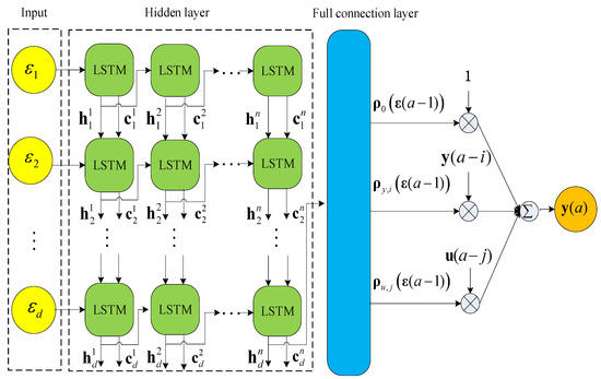 where represents output; represents input; represents white noise; , are model’s orders; denotes time delay; represents the input data at time , which may correspond to the system’s input or/and output; , , and represent the model’s function coefficient; n denotes the number of hidden layers; and represent the hidden layer state and cell state of the -th hidden layer of time step at time ; , , and represent activation functions (e.g., Hard Sigmoid and Tanh) that are employed to improve the model’s capability in capturing the system’s nonlinearity; ,, and represent offsets; , , and represent weight coefficients.