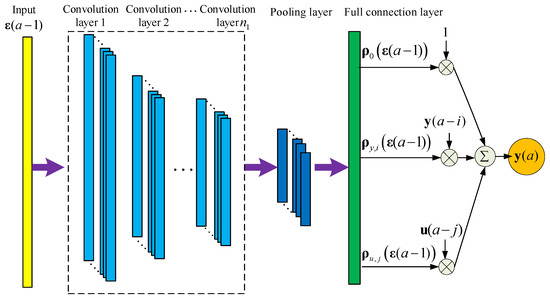 CNN has strong nonlinear feature extraction capabilities. The CNN-ARX model is derived by fitting the SD-ARX model’s coefficients to CNN. This model combines the ability of CNN’s local feature extraction and the SD-ARX model’s expression. Compared to traditional neural networks, CNN has the characteristics of local connections, weight sharing, pooling operations, etc., which can further decrease the complexity and overfitting risks of the model and enable the model to possess a certain level of robustness and fault tolerance. Figure 4 describes the CNN-ARX model’s architecture and its expression below: