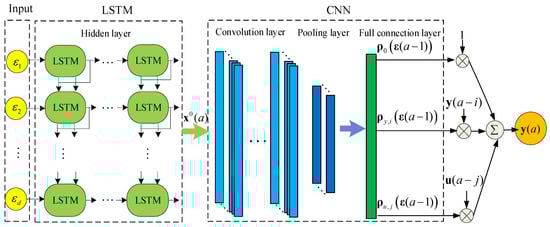 The LSTM-CNN-ARX model is obtained by combining LSTM and CNN to approximate SD-ARX model coefficients, as shown in Figure 5. First, employ LSTM for learning the temporal characteristics of the input data, followed by the utilization of CNN to capture the spatial characteristics, and finally calculate the SD-ARX model’s correlation coefficients through a full connection layer to obtain the LSTM-CNN-ARX model. This model integrates the spatiotemporal characteristic extraction ability of LSTM-CNN with the expressive power of the SD-ARX model; this approach effectively captures the nonlinear system’s dynamic features. The LSTM-CNN-ARX model’s mathematical expression is obtained from Formulas (6) and (7), as follows: