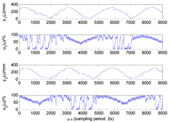 where represents the liquid level heights of tank 1 and tank 2; represents the openings (0%~100%) of electric control valves EV1 and EV2; , , and are the weight coefficients, which can be obtained by models (6)–(8); indicates the white noise signal. Among them, we have set the working point because the change in water level is an important factor leading to the strongly nonlinear dynamic characteristics of the water tank system.