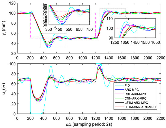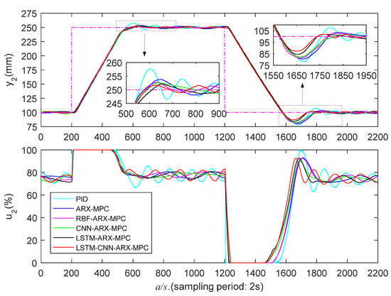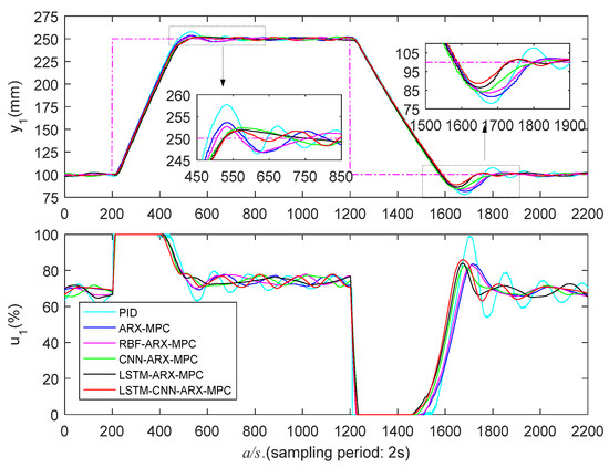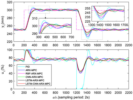 The model training in this study was implemented using the Keras [55] framework in the Jupyter Notebook 5.5.0 software development environment on a PC (Intel i9-11900k 3.5 GHz, 16 GB RAM). The supervisory control software used for the real-time control experiments was Kingview 6.55. Data communication between Matlab/Simulink 2022b software and Kingview 6.55 was achieved via the Dynamic Data Exchange (DDE) protocol, enabling real-time control of the water tank system. Taking the LSTM-CNN-ARX model as an example, Figure 9 and Figure 10 show that the model’s training and testing residuals are very small and the models have high modeling accuracy. Table 2 illustrates that different models have varying structures because they have distinct characteristics and nonlinear description capabilities. At the same time, the model with more parameters and deeper network layers has stronger nonlinear expression ability, but this also increases the computational burden, resulting in a longer training time. The findings suggest that the ARX model exhibits the maximum MSE and cannot capture the nonlinear system’s dynamic behavior well. The deep learning-based ARX model has a lower MSE than the RBF-ARX model because the multi-layer deep learning network has stronger nonlinear expression capabilities than the single-layer RBF neural network. The LSTM-ARX model has less MSE than the CNN-ARX model because LSTM can maintain long-term dependencies on sequence data. In addition, because the LSTM-CNN-ARX model incorporates the strengths of LSTM for learning temporal characteristics and CNN for capturing spatial characteristics, its MSE is smaller than the LSTM-ARX and CNN-ARX models, which can accurately capture the water tank system’s nonlinear behavior.